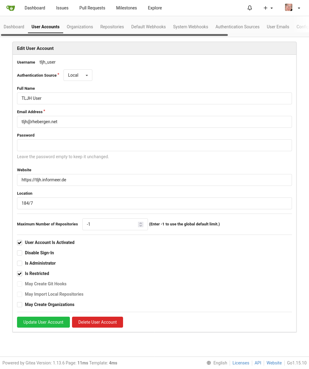 All these actions take place using the gitea webinterface (mostly as admin). NB: the token generated allows one to login using the API and without the need for a password. This token is generated ad displayed only once and is not stored by the system itself (on purpose). This means you should save it yourself. When executing the above set the rights/permissions appropriately (minimised).